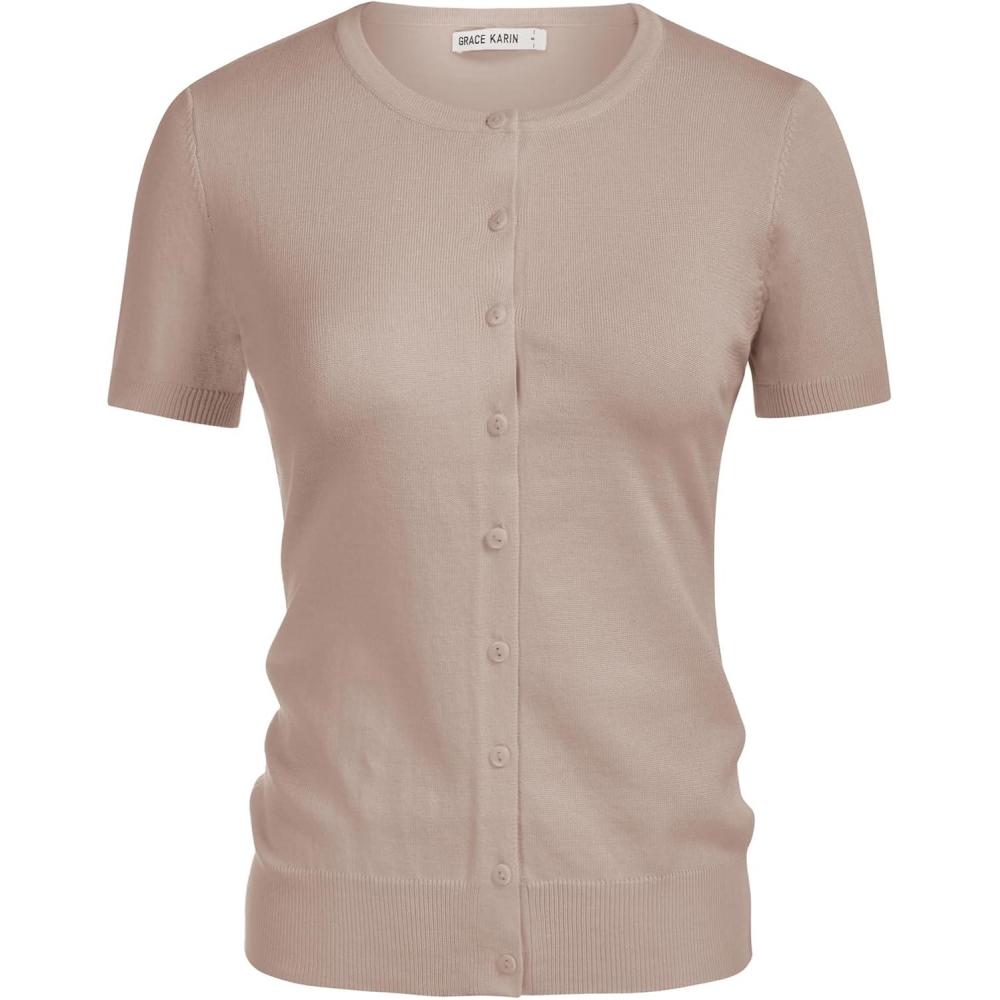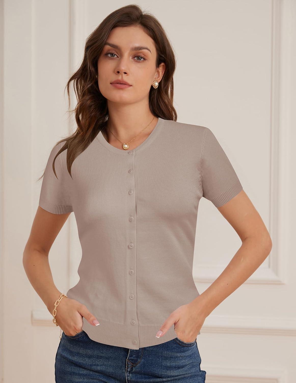 Womens Short Sleeve Cardigan Crewneck Basic Casual Button Down Knit Soft Sweater(Khaki)