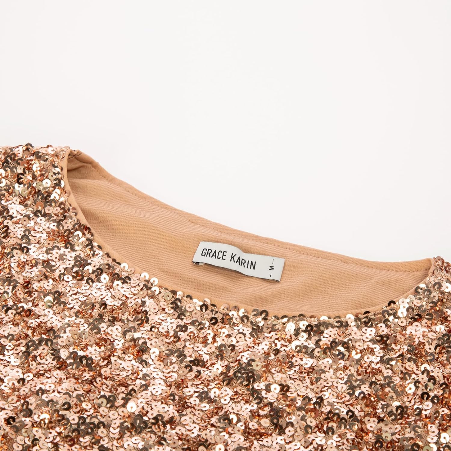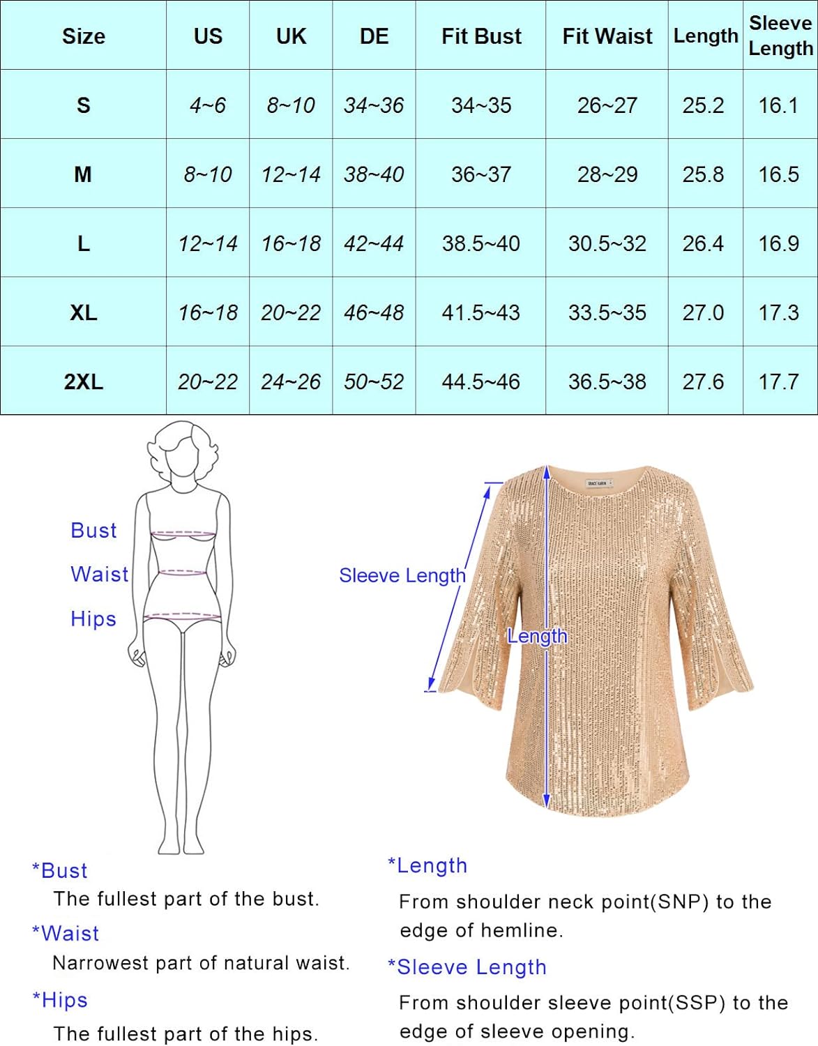 Features:Slit three quarter length sleeves, Crew neck, Sparkling sequins, Garment is medium elastic, fully Lined. Sequin tops for women party tunic tops, chic look- full sequin layer decoration makes this top shimmering; 3/4 sleeve makes you more sexy