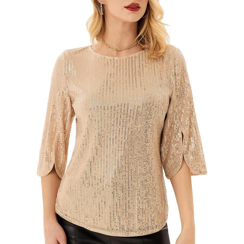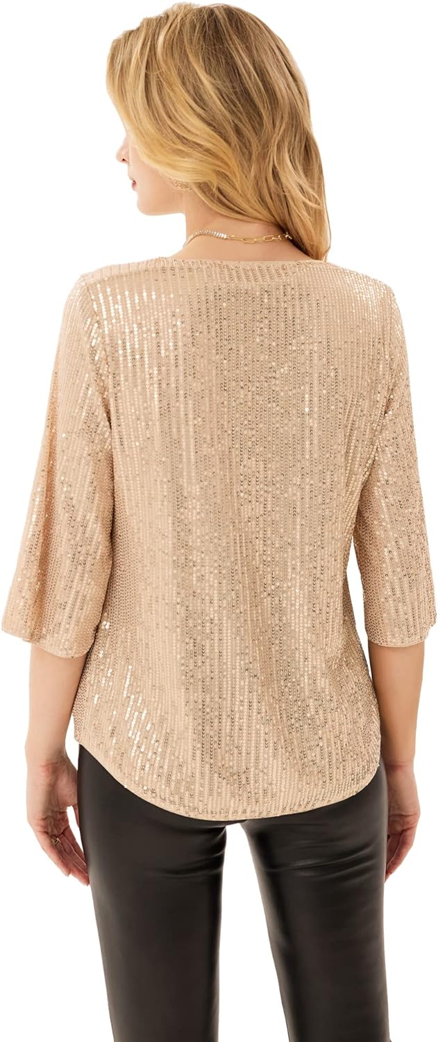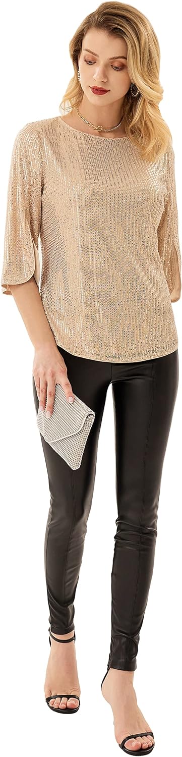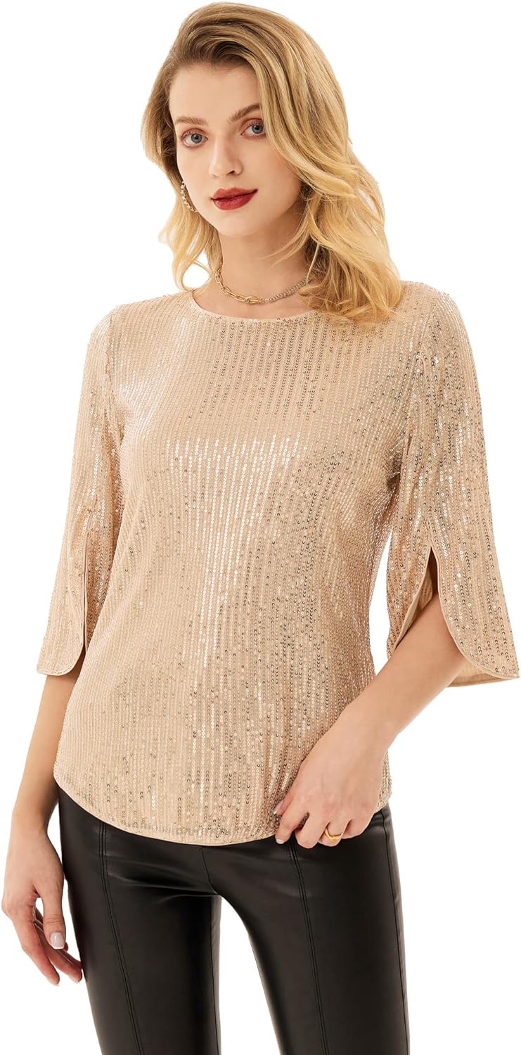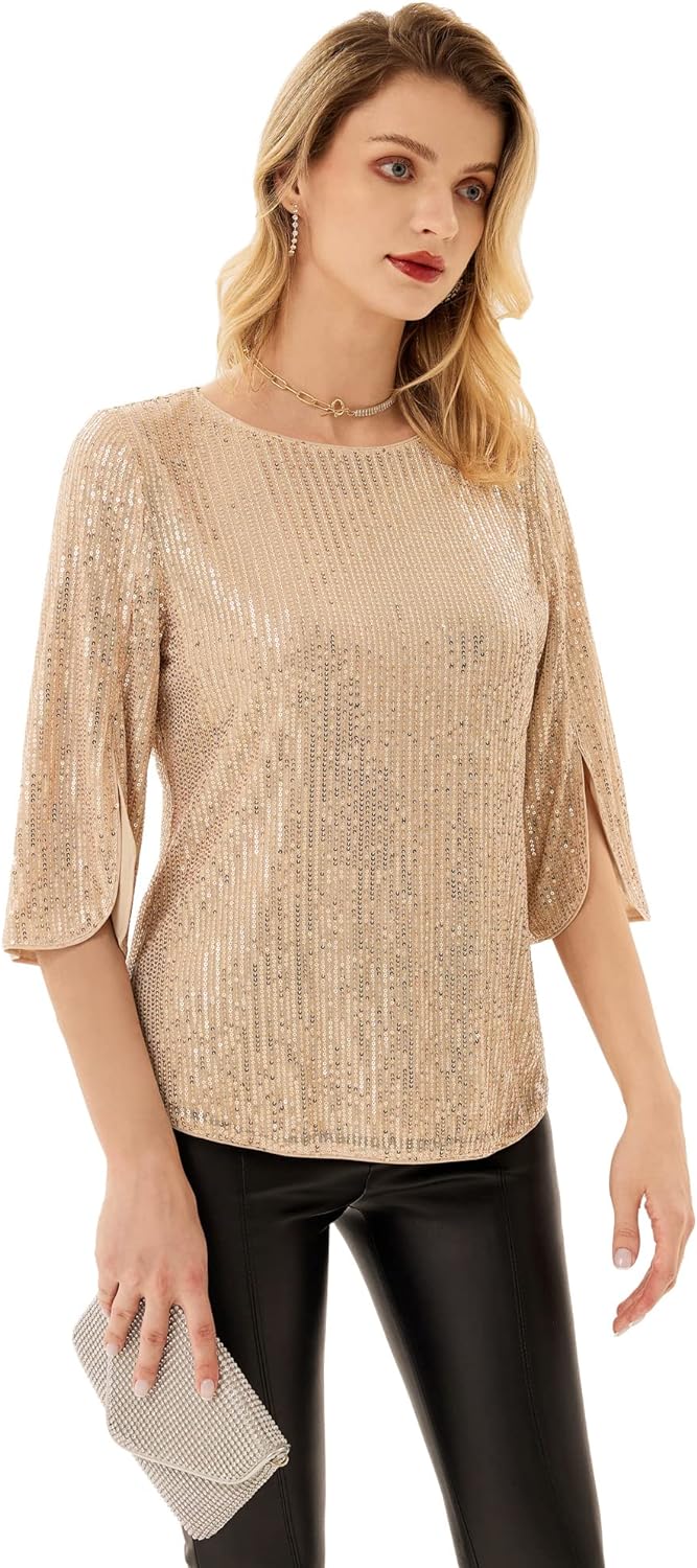 Womens Sparkle Sequin Party Blouse Tops Shimmer Glitter 34 Slit Sleeve Dressy TopsGold