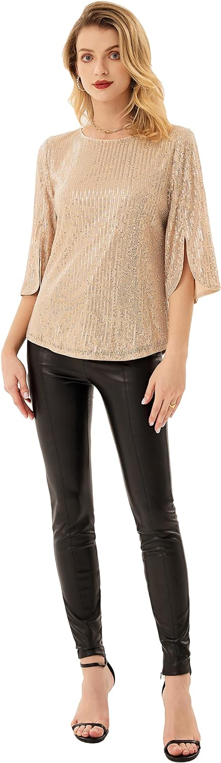 Features:Slit three quarter length sleeves, Crew neck, Sparkling sequins, Garment is medium elastic, fully Lined. Sequin tops for women party tunic tops, chic look- full sequin layer decoration makes this top shimmering; 3/4 sleeve makes you more sexy