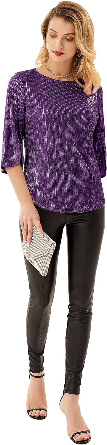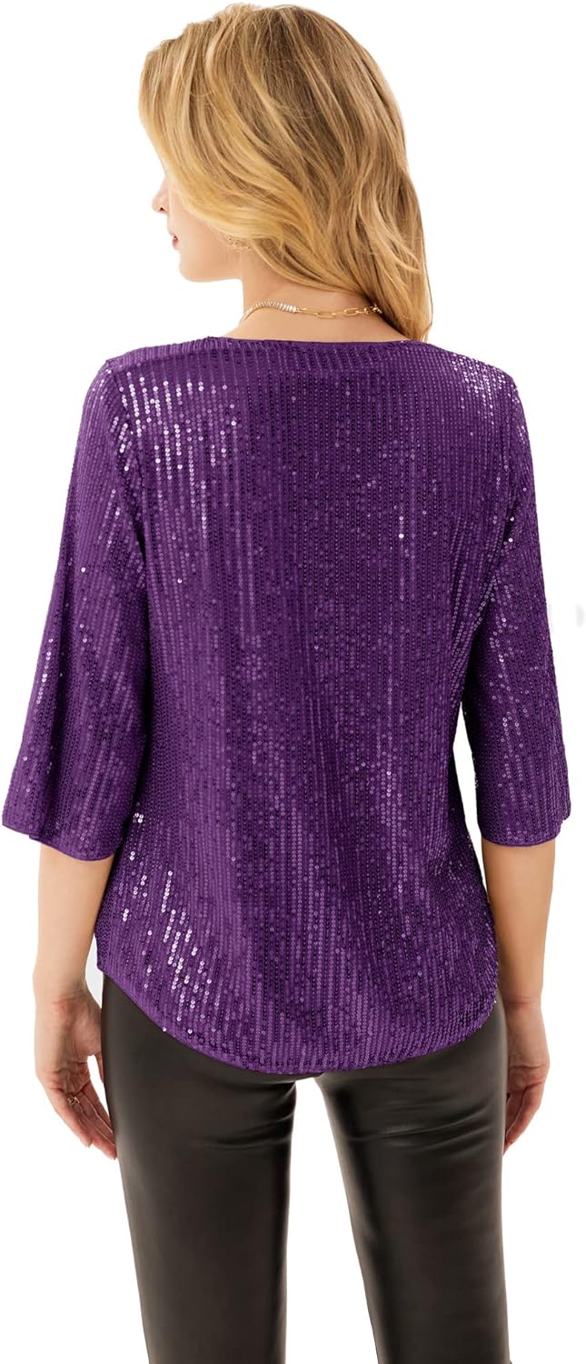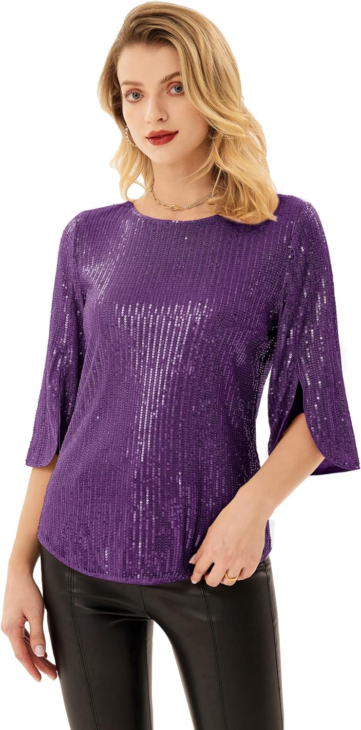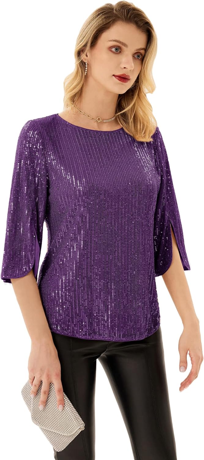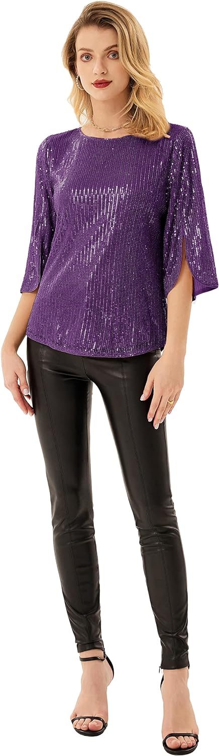 Women's Sparkle Sequin Party Blouse Tops Shimmer Glitter 3/4 Slit Sleeve Dressy Tops(Purple)