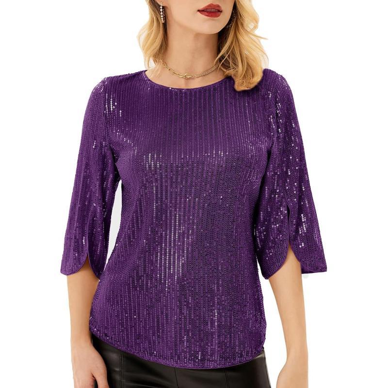 Womens Sparkle Sequin Party Blouse Tops Shimmer Glitter 34 Slit Sleeve Dressy TopsPurple