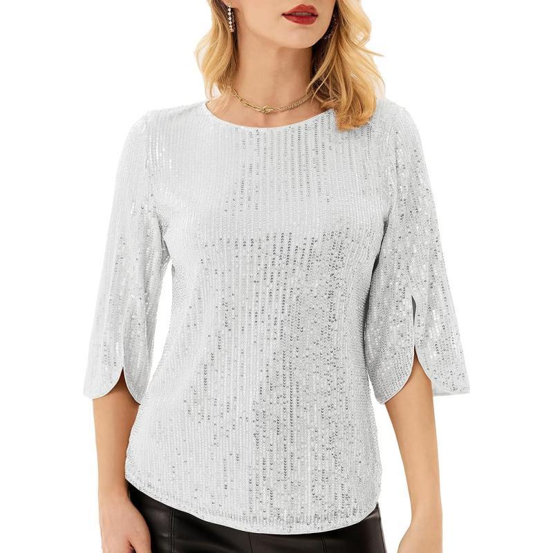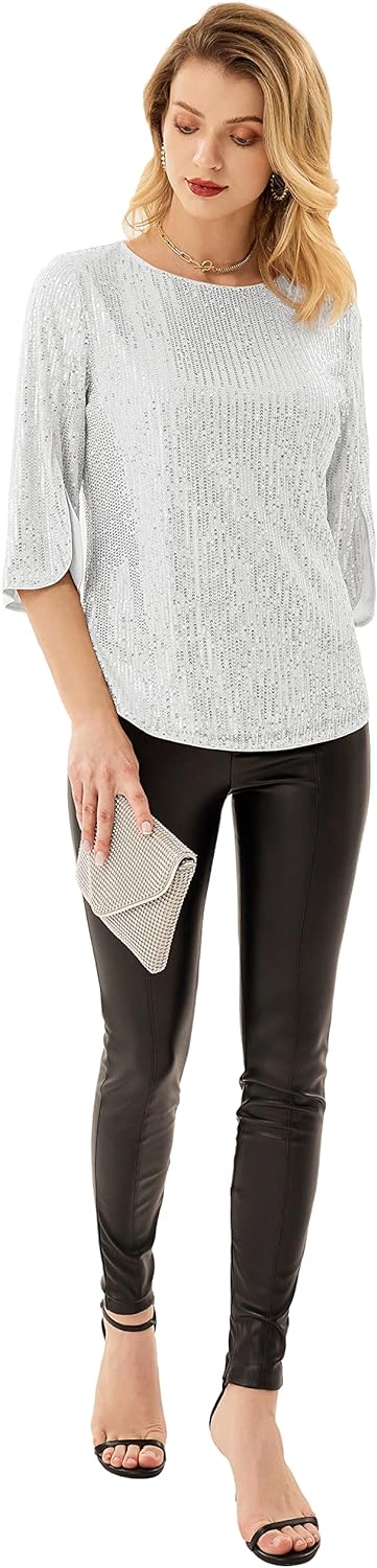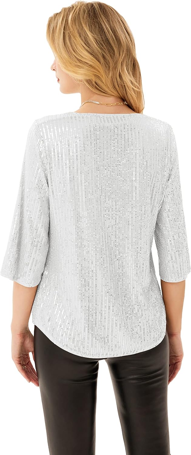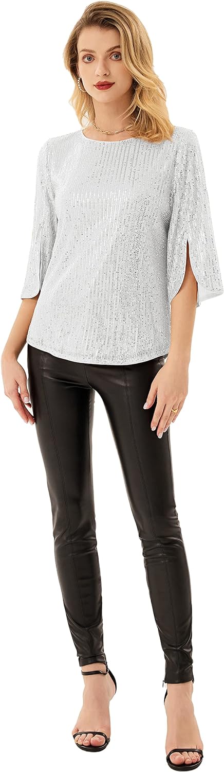 Women's Sparkle Sequin Party Blouse Tops Shimmer Glitter 3/4 Slit Sleeve Dressy Tops(Silver White)