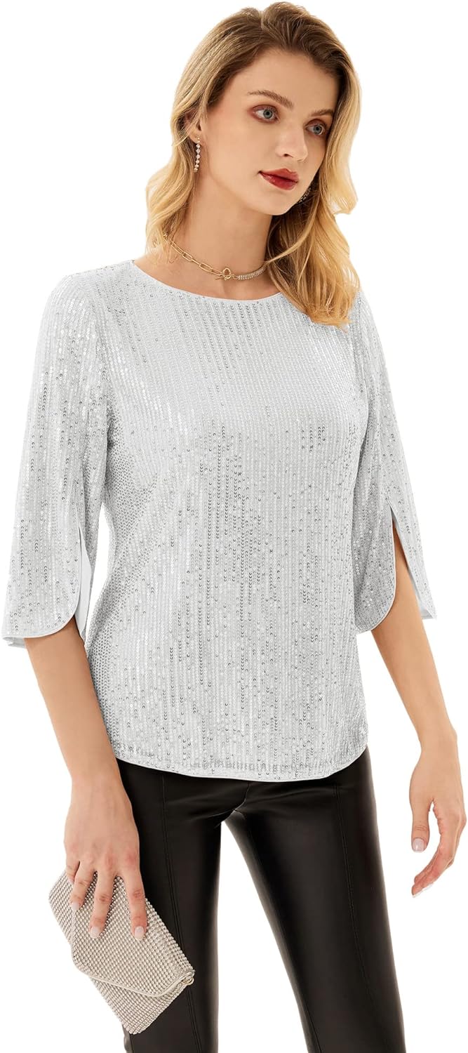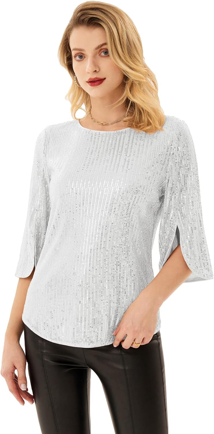 Women’s Sparkle Sequin Party Blouse Tops Shimmer Glitter 3/4 Slit Sleeve Dressy Tops(Silver White)